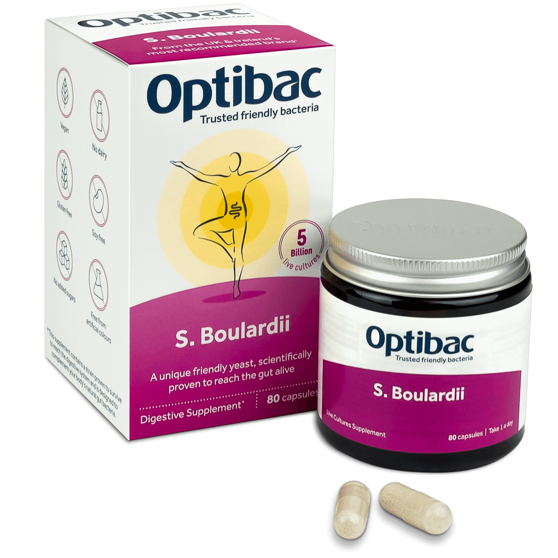 Saccharomyces boulardii supports the digestive system, providing 5 billion live microorganisms. This strain has been shown in research to be particularly effective at treating diarrhoea.